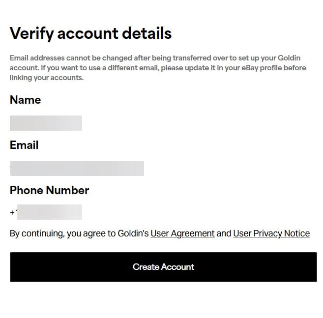 Once the user logs in with their eBay username and password, it will request to verify the account details to create a new account on Goldin (if you don't already have one set up). You'll only need to verify once - after the initial set up, entering your eBay credentials should immediately log you in to Goldin.co