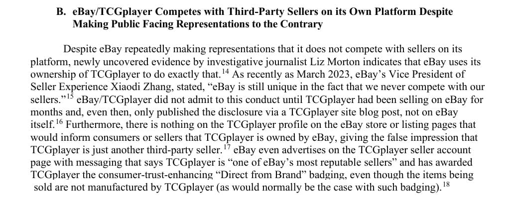 But any claim that eBay doesn't compete with sellers was blown out of the water in 2023 when they quietly set up shop on their own platform under subsidiary TCGPlayer brand, selling Magic the Gathering and other trading card games in direct competition with third party sellers.