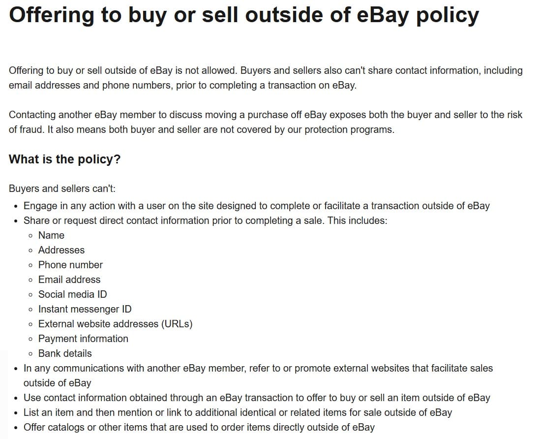 It's also worth noting that eBay has very strict policies against "offering to buy or sell outside of eBay" which can see sellers penalized for using buyer contact information to try to take a sale off eBay or linking to another website within their listings.