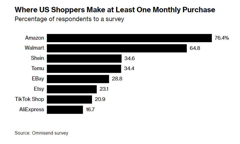 An April survey of 1,000 consumers found that 34% of respondents buy something from Temu at least once a month, edging out eBay’s 29%. Amazon.com Inc. remains the stand-out leader, with more than three of four respondents saying they shop there at least once a month, according to London-based online marketing firm Omnisend, which conducted the survey.