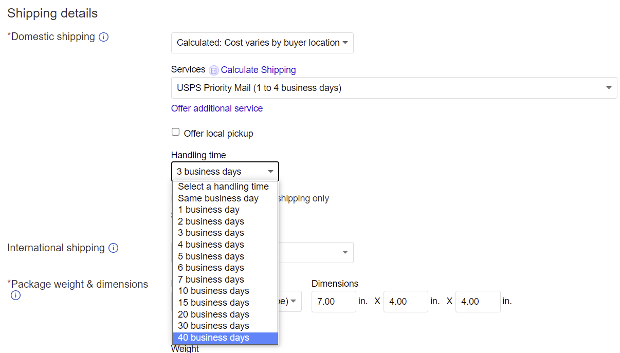 - Handling time details should include the time it will take the seller to acquire the item, in addition to the time it will take the seller to deliver the package to the shipping carrier