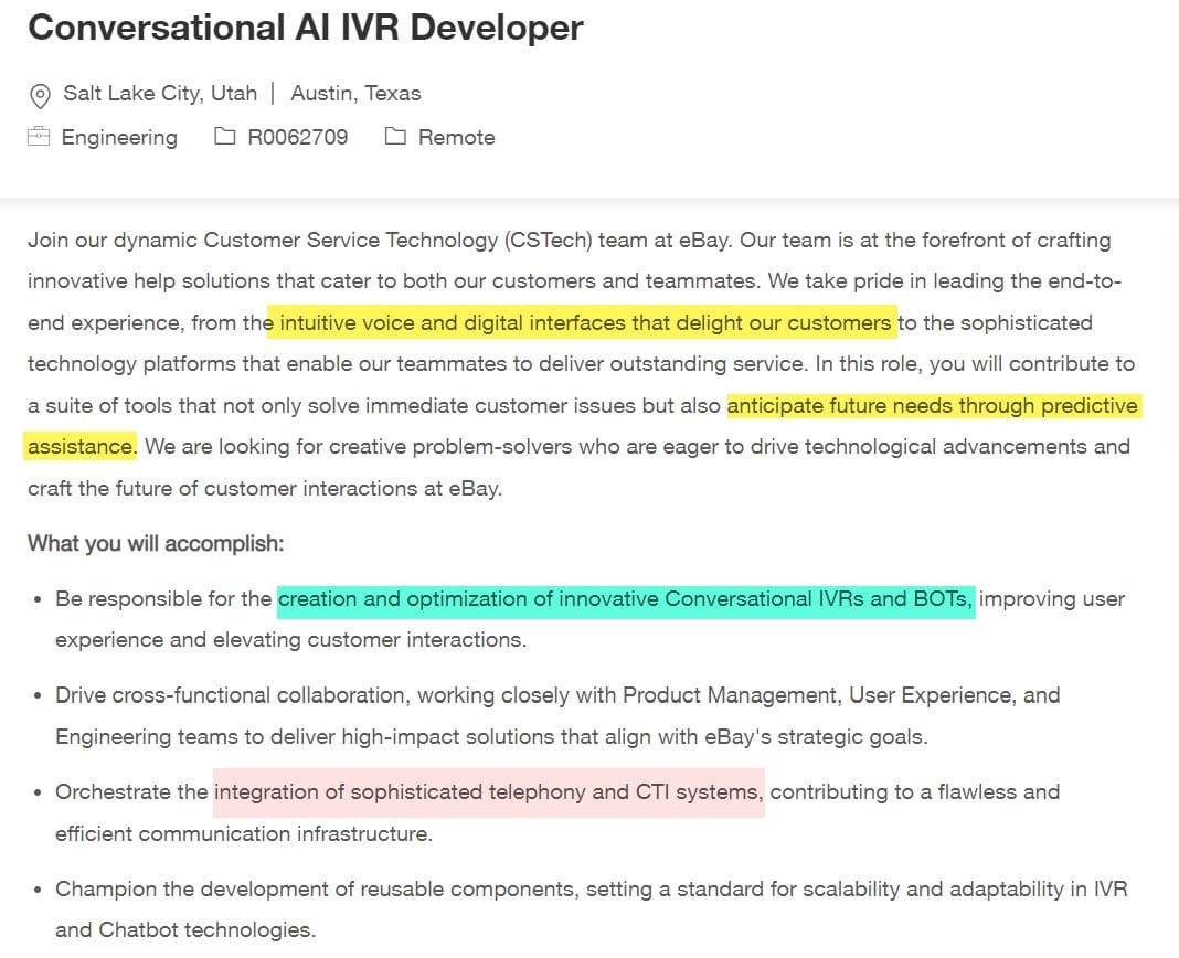 eBay is also currently looking to hire Conversational AI IVR Developers, with the explicit goal to "orchestrate the integration of sophisticated telephony and CTI systems" and develop "a suite of tools that not only solve immediate customer issues but also anticipate future needs through predictive assistance."