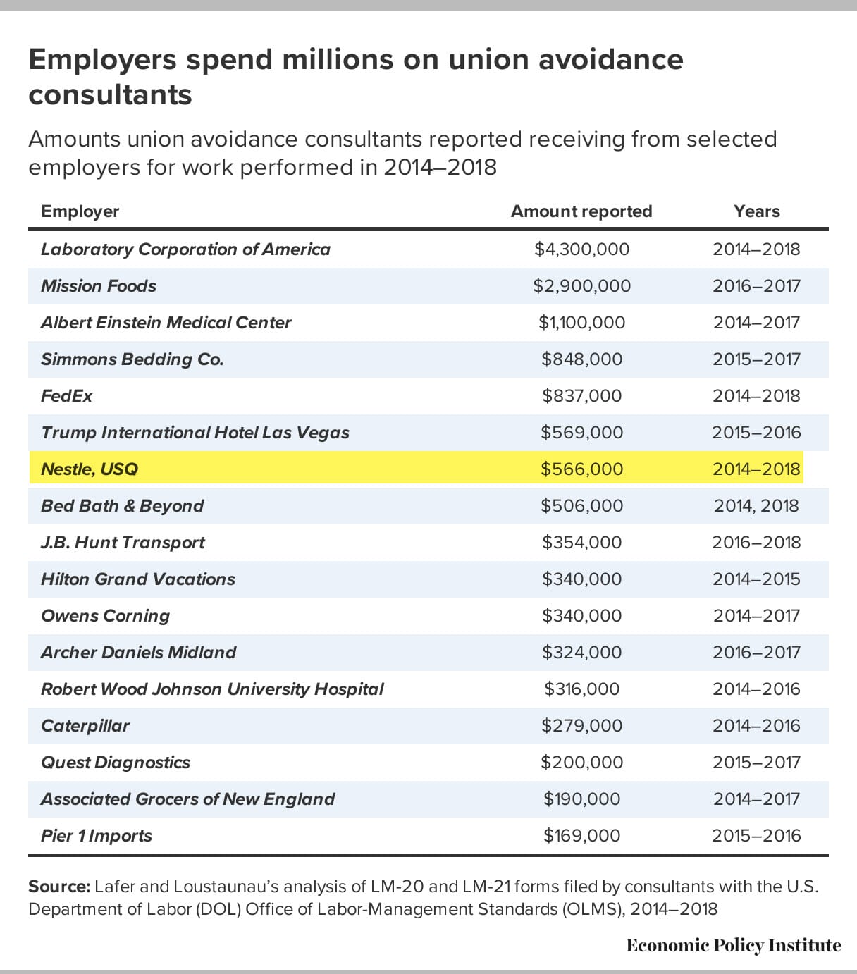 A 2020 report by the Economic Policy Institute about how employers use threats and intimidation to stop workers from exercising their rights included Nestle in their list of companies that hired union avoidance consultants that "help employers exploit the weaknesses of federal labor law to deny workers the right to collective bargaining."