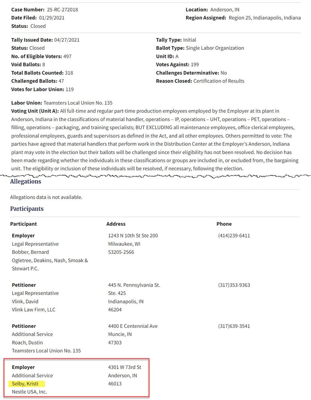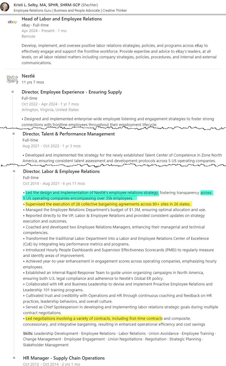 Nestle is of course a giant corporation with many people involved in labor relations at various levels, but Selby's LinkedIn profile shows she was directly involved in contract bargaining at over 80 sites across 26 states during her tenure, so she is certainly very familiar with how the company handled labor relations in the US during that time.