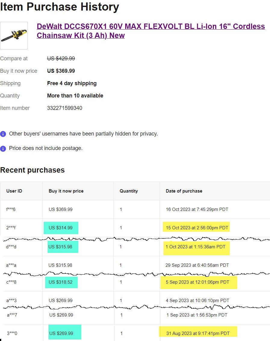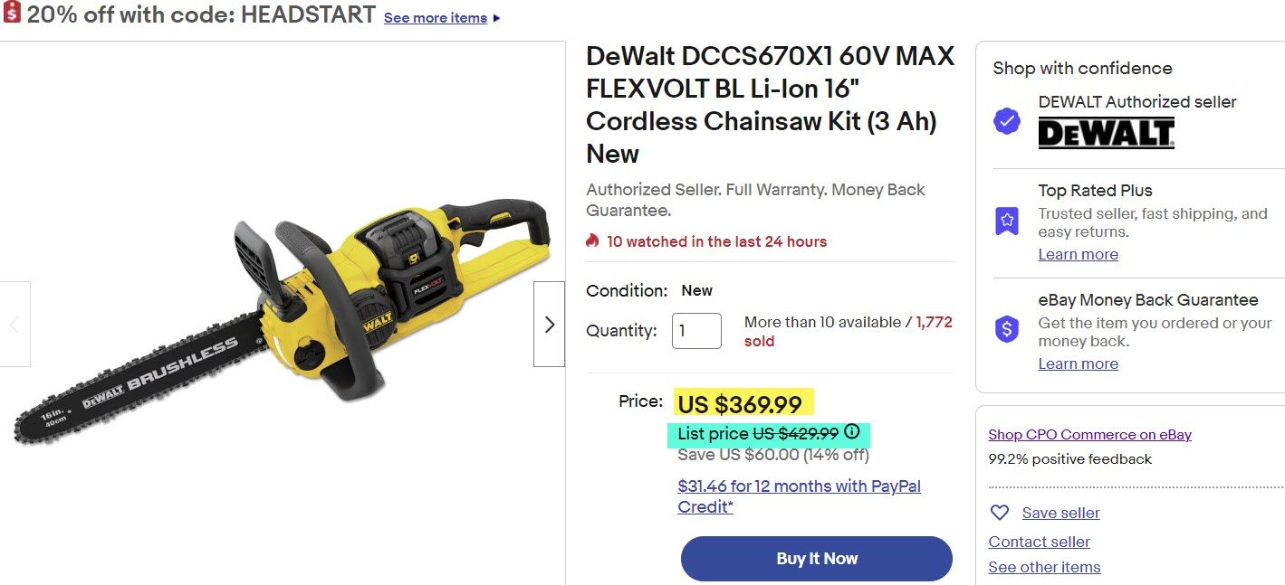This Dewalt chainsaw is currently priced at $369.99, a supposed 14% ($60) savings off of the regular price of $429.99.