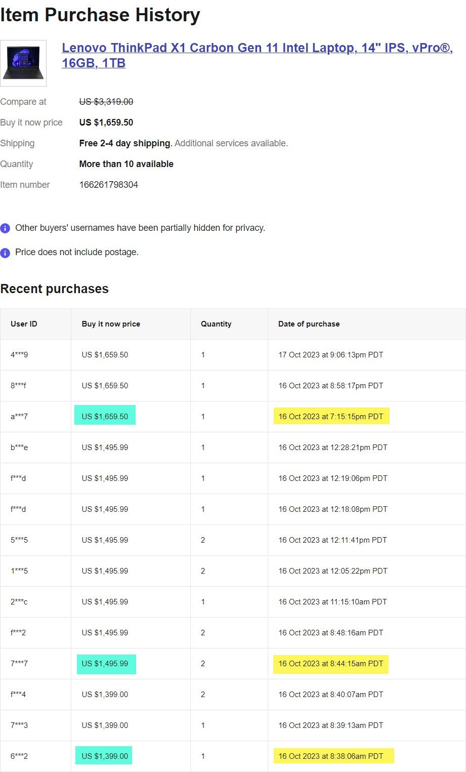 But again, the purchase history shows not only has it not been previously offered at that seemingly fictitious list price of $3,319.00, it was in fact available to purchase at a regular price without discount of $1,399.00 the day before this supposed "sale" started.