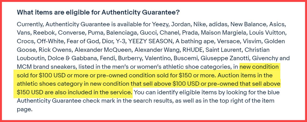 It's also important to note that eBay makes no final value fees on sneaker sales over $100. That's right, 0% Final Value Fee, no $0.30 fixed per transaction fee, and no insertion fees - meaning the costs of the entire authentication process are not being paid directly from these sales.