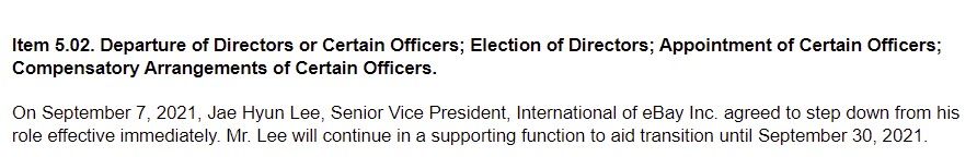 On September 7, 2021, Jae Hyun Lee, Senior Vice President, International of eBay Inc. agreed to step down from his role effective immediately. Mr. Lee will continue in a supporting function to aid transition until September 30, 2021.