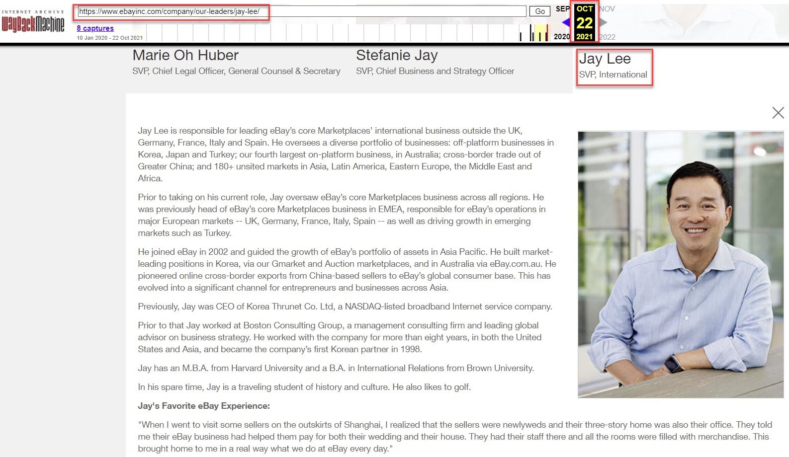 It appears eBay finally removed Jay Lee from the "our leaders" page on October 29th, almost a full month after his "supporting function" time was up and conveniently also after eBay's Q3 earnings call.