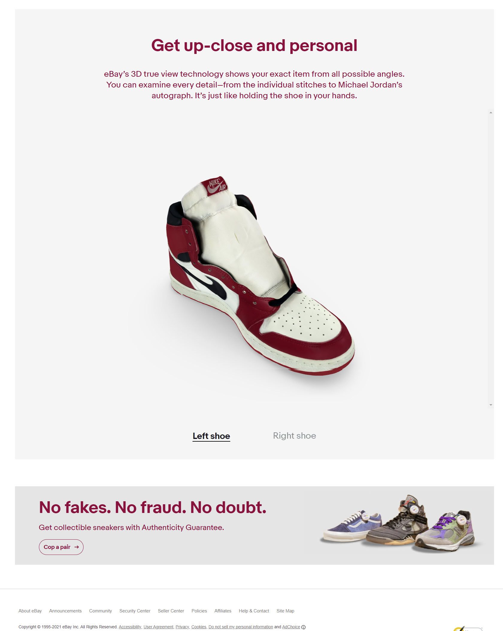eBay’s 3D true view technology shows your exact item from all possible angles. You can examine every detail—from the individual stitches to Michael Jordan’s autograph. It’s just like holding the shoe in your hands.