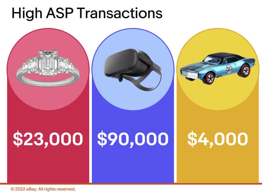 For high Average Selling Price (ASP) carts or transactions, eBay will be providing additional payment options like wire transfers and split payments. Julie did not specify a dollar amount but gave $23,000, $90,000, and $4,000 examples.