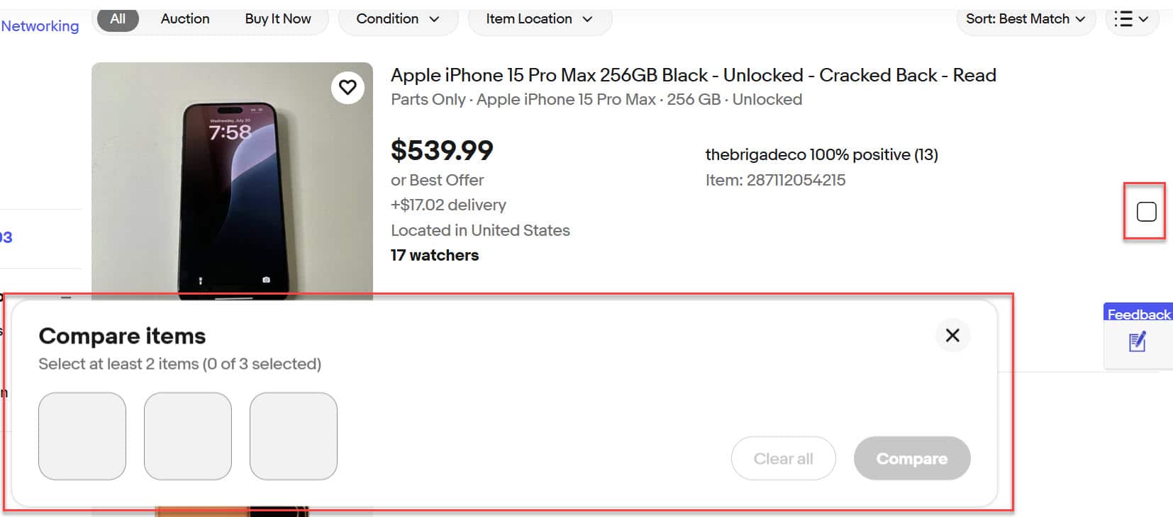For items using Promoted Listings Priority cost per click ads, if your item is shown in search as Sponsored and a prospective buyer clicks the checkbox to put it in this "compare" module with other items - that will count as a "click" and you will pay whatever ad rate is applicable, even if the buyer never actually views your full item listing page.