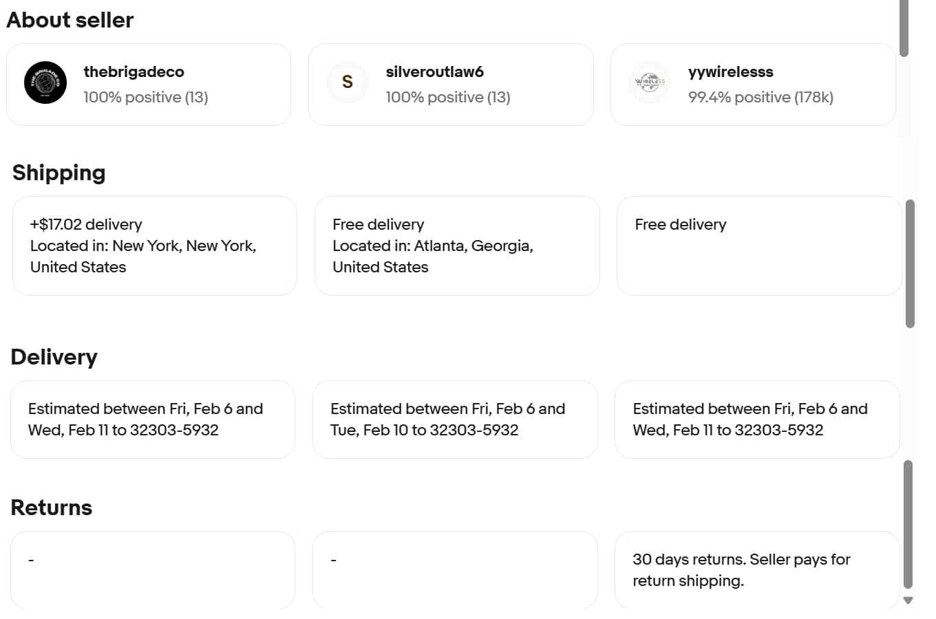 The same holds true for other data points - for example, when it comes to returns, items that do not allow returns simply have a "-" rather than saying no returns accepted.