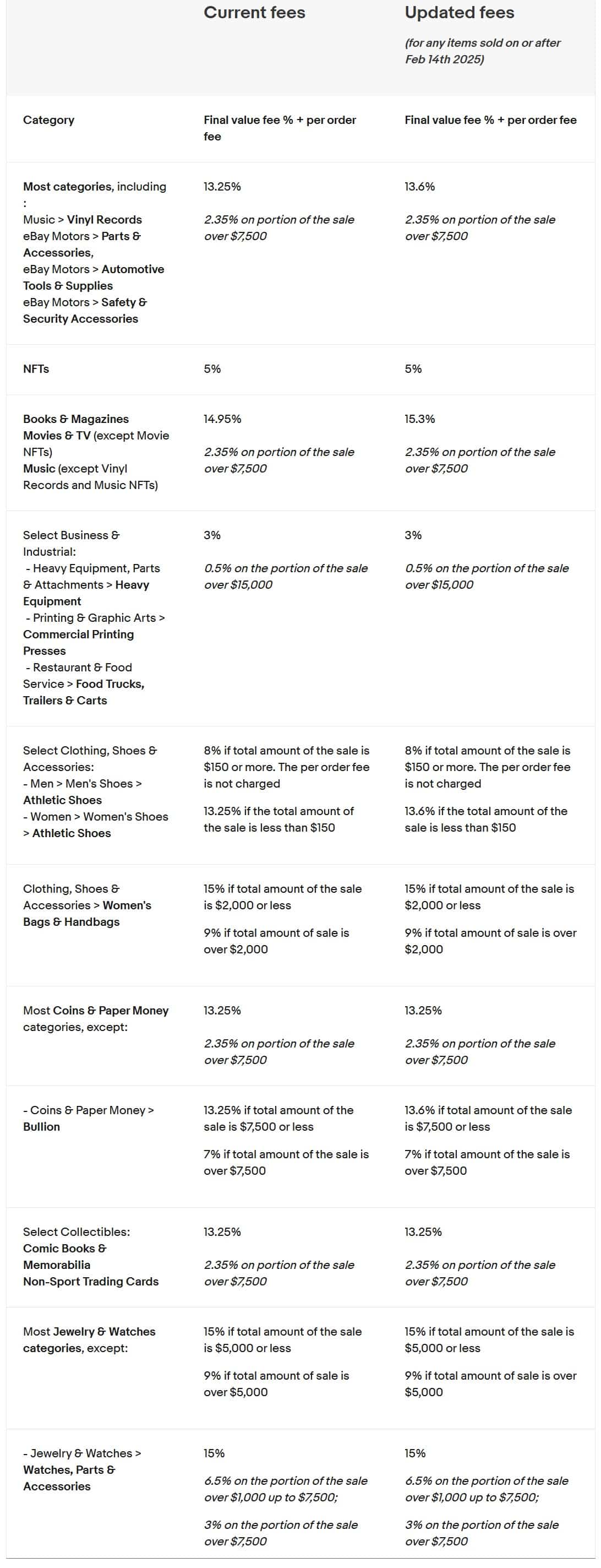 To support these and future enhancements, we’ll be adjusting final value fees in most categories starting February 14, 2025, with increases ranging up to a maximum of 0.35%.