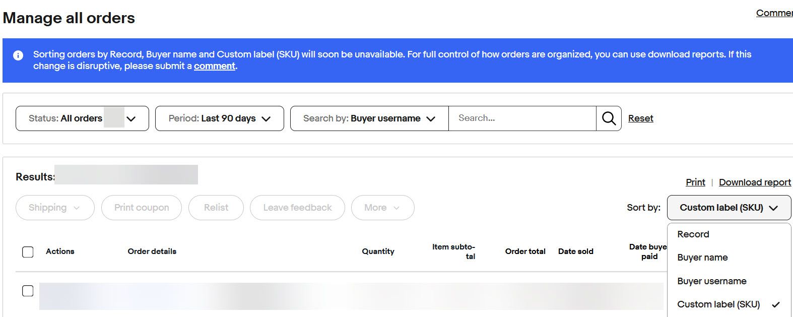 Sorting orders by Record, Buyer name and Custom label (SKU) will soon be unavailable. For full control of how orders are organized, you can use download reports. If this change is disruptive, please submit a commentopens in a new window or tab.