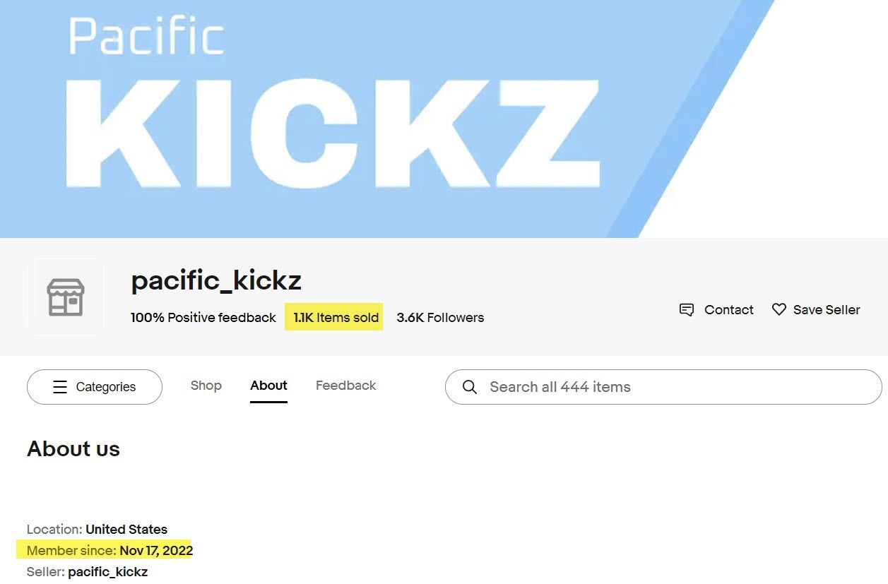 The Pacific_Kickz account was created November 17, 2022 and has already sold over a thousand items.