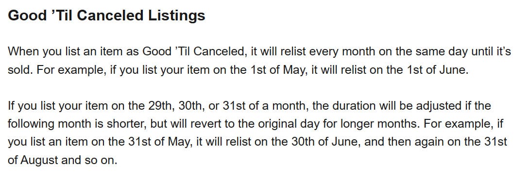 Here's how it works: Good 'Til Canceled listings renew every month on the same day of the month as the item was originally listed - but that creates an issue for items listed at the end of a month since some month have more days than others.