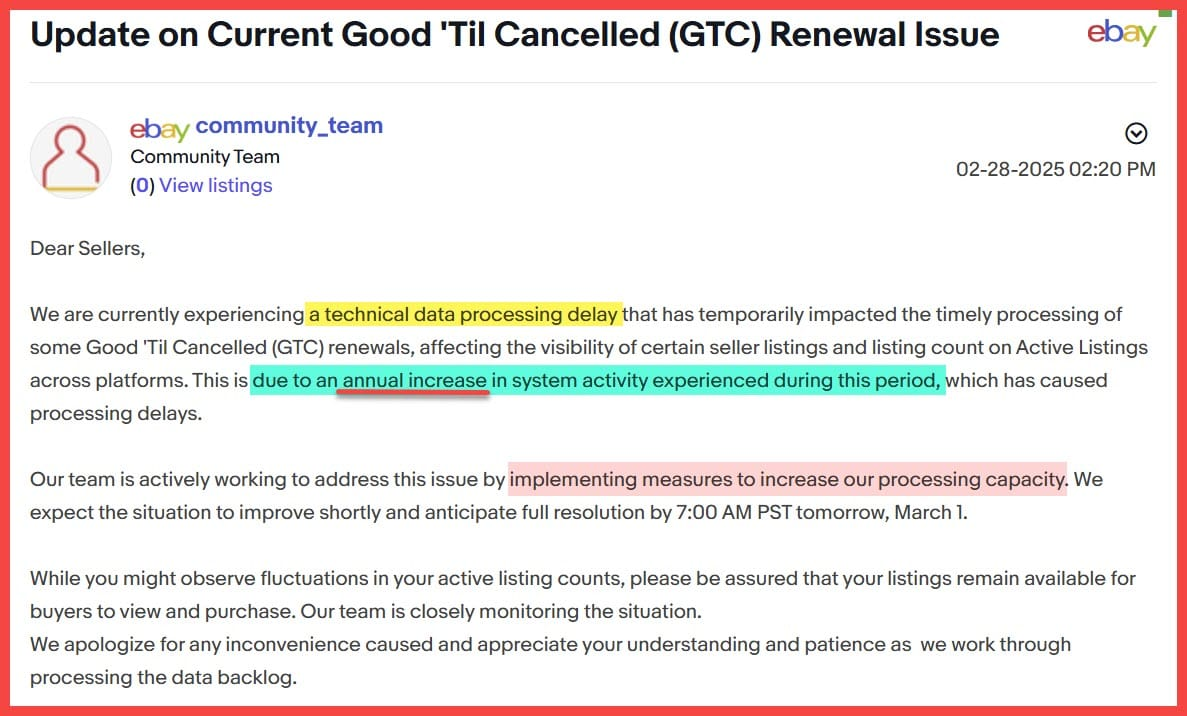That raises the question - if eBay knows this is an annual occurrence because of the way GTC works, why would they not proactively implement measures to increase the processing capacity ahead of this entirely predictable event?