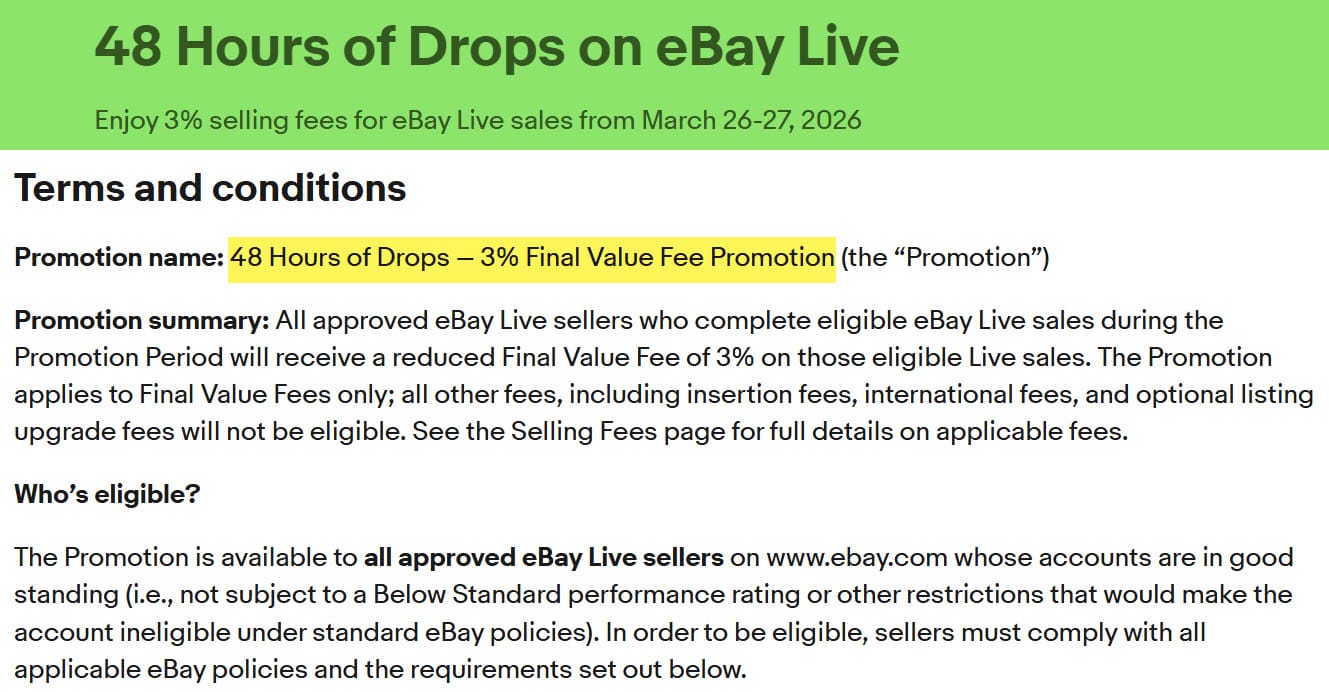 To add insult to injury for regular sellers who are already feeling left behind by eBay's new strategy, Live sellers participating in this 48 hour event are receiving a special discounted Final Value Fee promotion, paying only 3% sales commission on items sold during the event.