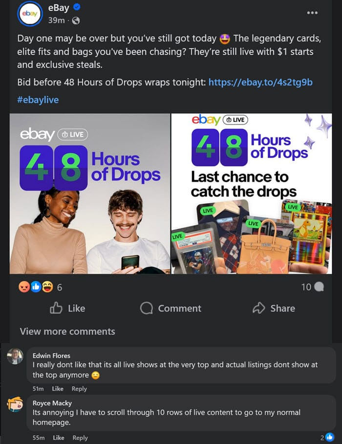 eBay Live is pushing a 48 hour livestream bonanza with major publicity blitz promising exclusive drops, but disruptive homepage takeover threatens to alienate regular shoppers who are flooding social media with hot takes on the live selling trend.
