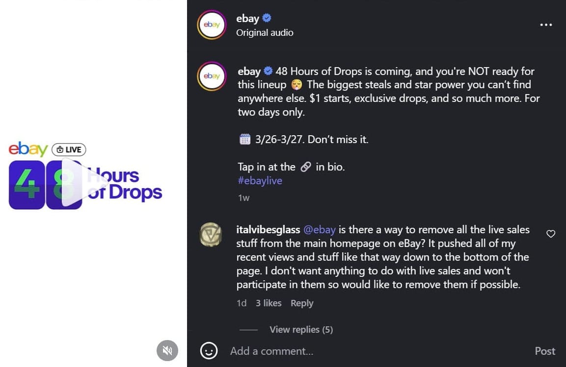 eBay's social media posts about the event are also receiving some very pointed feedback about the homepage takeover.