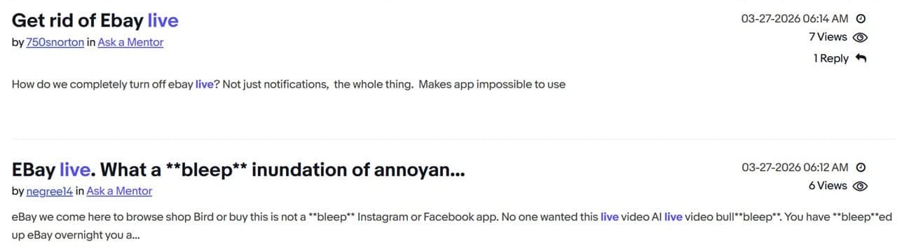 Searching the eBay community for the word "live" brings up over 100 results just from the last 2 days from users desperately seeking ways to block the infiltration of eBay Live into their homepage and browsing experience.