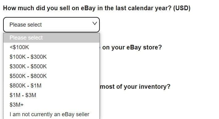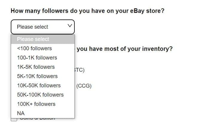 First, eBay wants to know how many sales and followers you have already on the site.