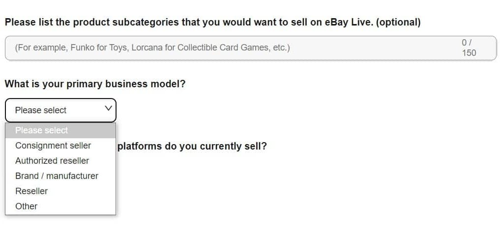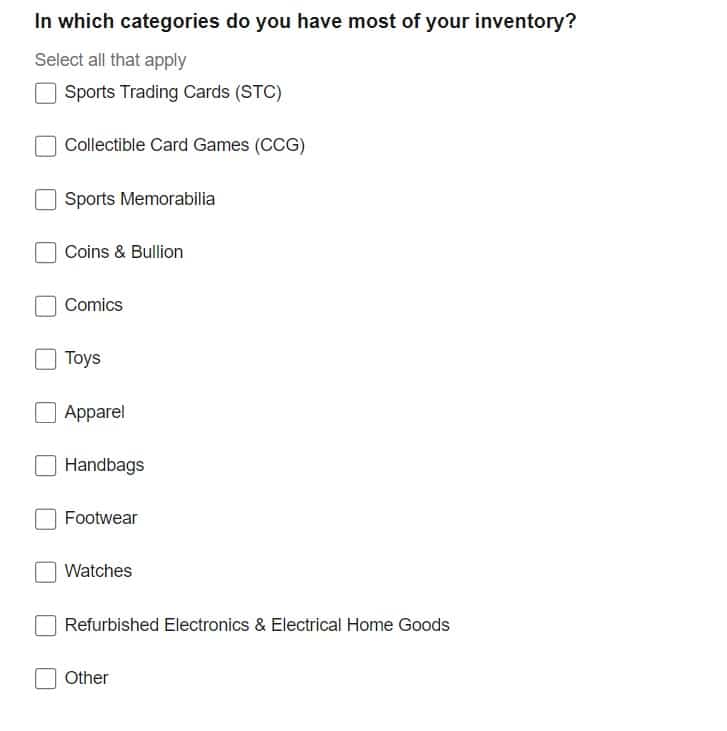 They also want to know what categories of inventory you have (Sports Trading Cards, Collectible Card Games, Sports Memorabilia, Coins & Bullion, Comics, Toys, Apparel, Handbags, Footwear, Watches, Refurbished Electronics, Other) and whether your primary business model is as a consignment seller, authorized reseller, brand/manufacturer, reseller or other.