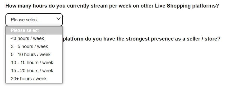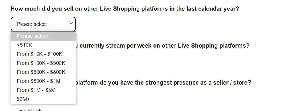 Next, eBay wants details about your activity on competing platforms including how many followers you have on social media and a dollar amount earned in the last year and time spent streaming per week.
