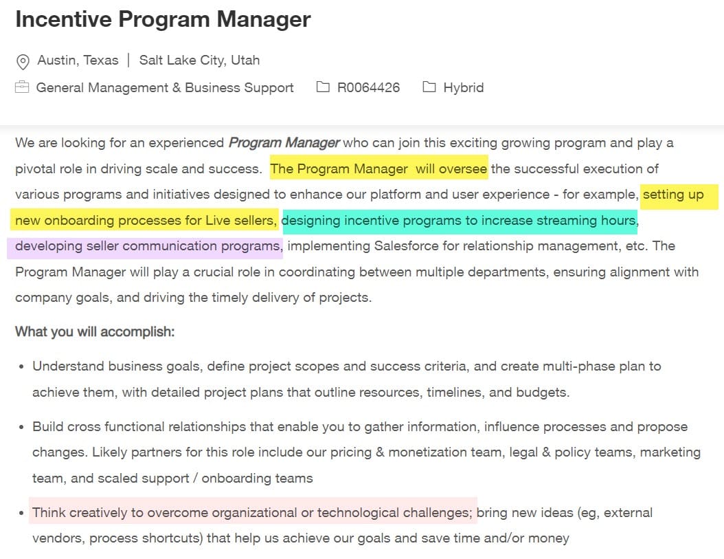 Toward that end, it also appears that eBay is working to create an incentive program for eBay Live, with a new job ad looking to hire an Incentive Program Manager specifically to "set up new onboarding processes for Live sellers, design incentive programs to increase streaming hours, and develop seller communication programs."
