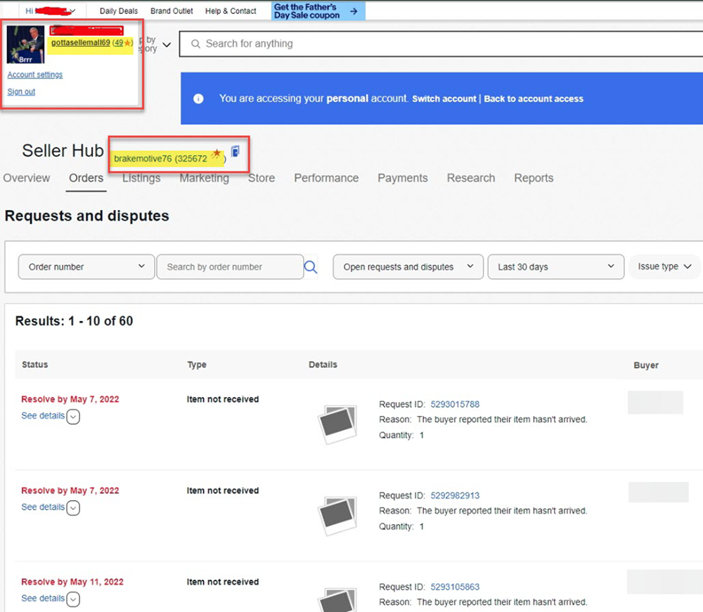 As you can see from the screenshot, the seller's ID (gottasellemall69) is shown in the upper left under account detail, however a completely different seller ID (brakemotive76) and account specific info for that different ID is shown on the Seller Hub disputes page.