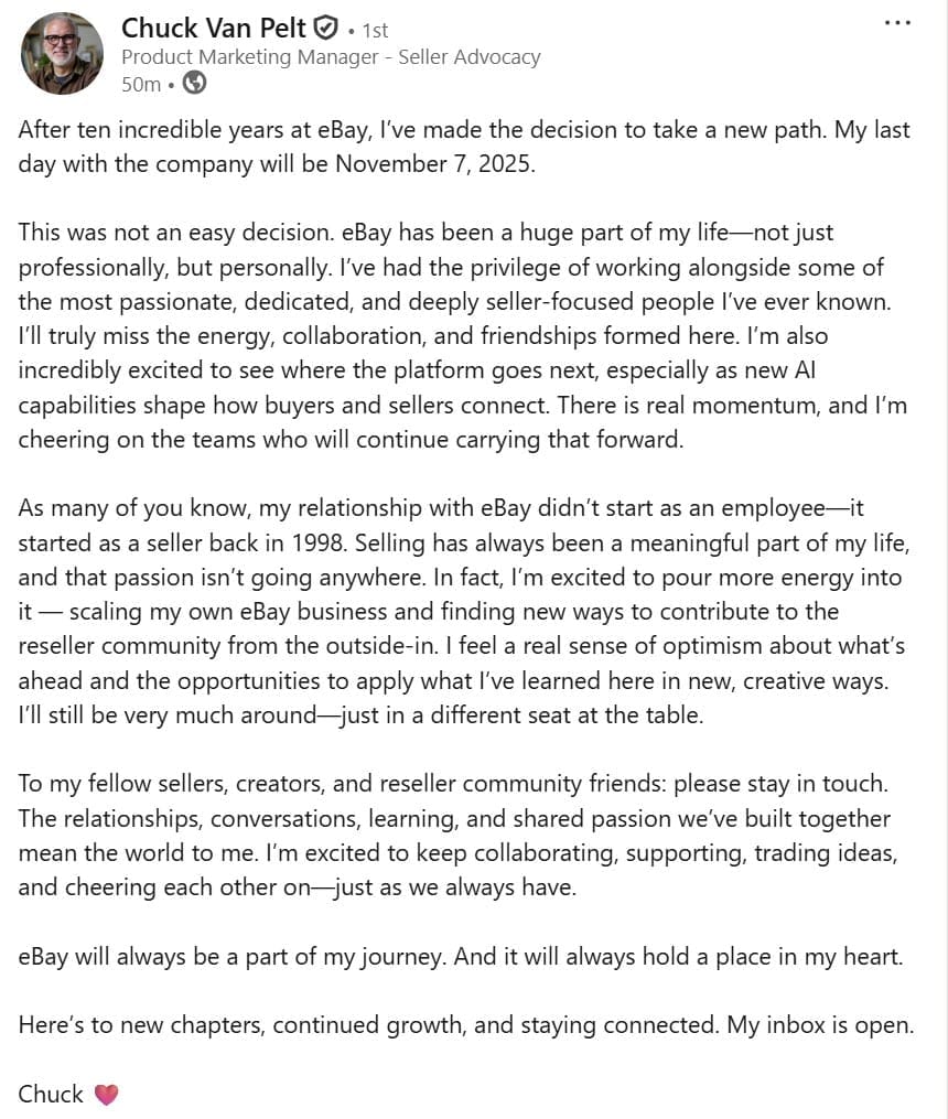eBay set to lose key Product Marketing Manager and Seller Advocate as Chuck Van Pelt announces he is leaving the company after 10 years to take a new path.