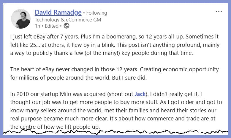 Ramadge is what eBay calls a "boomerang" having worked at the company for a stint from 2013-2014, moving on to co-found a media company and join Google for a short time, then returning to eBay in 2017 where he took over the role of GM Australia when Tim MacKinnon left to join Providoor and then was promoted to VP International Markets in 2023.