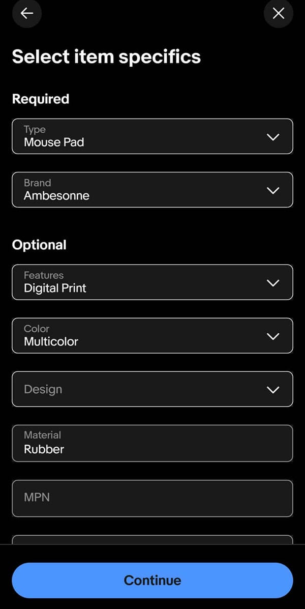 This simplified listing experience now integrates our magical listing technology, which allows sellers to take or upload a product image and use AI to help fill in item specifics. And, eBay has further simplified the experience with a guided, mobile-friendly listing flow.