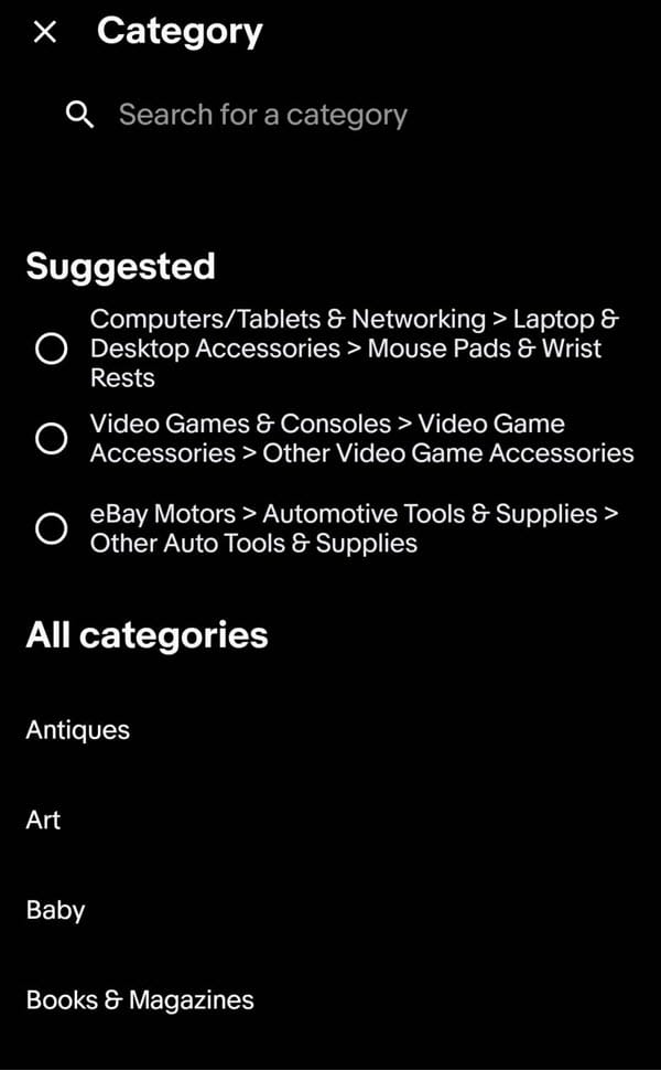 Unfortunately, the Magical Listing experience wasn't able to fill in the category automatically based on that title, so I had to do that manually too - choosing from a few suggestions, including an oddly out of place recommendation to put it in automotive tools and supplies.