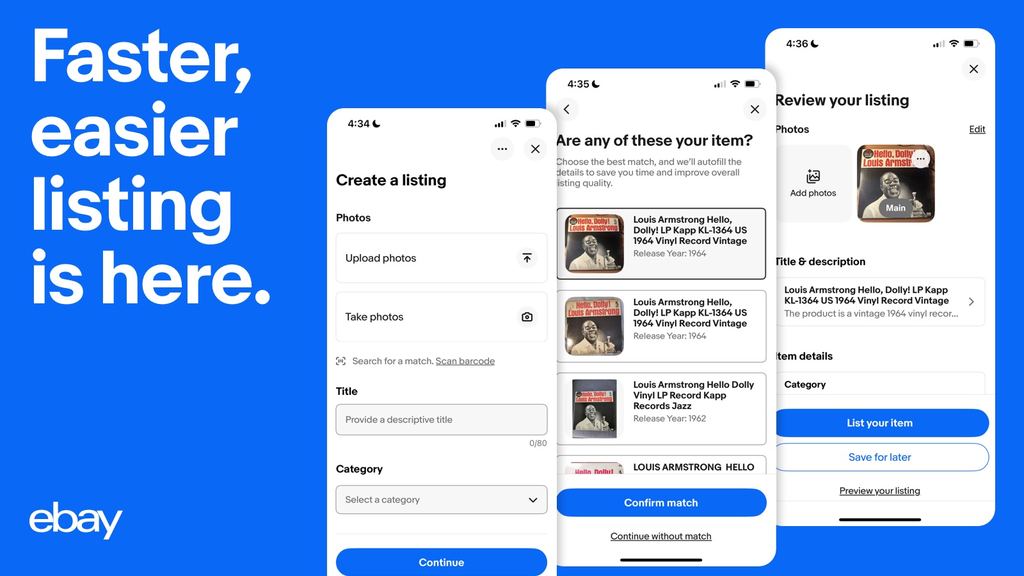 Where the previous mobile listing flow started with a text-based search for similar listings within eBay’s catalog for sellers to edit and customize, this new experience starts with photos and a title.