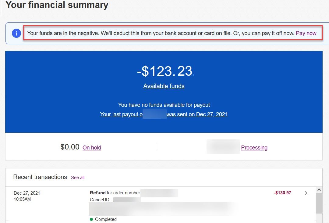 In eBay Managed Payments, fees and refunds are deducted from the seller's available balance. If a refund caused that balance to become negative, previously eBay would simply deduct those funds automatically back out from the bank account on file.
