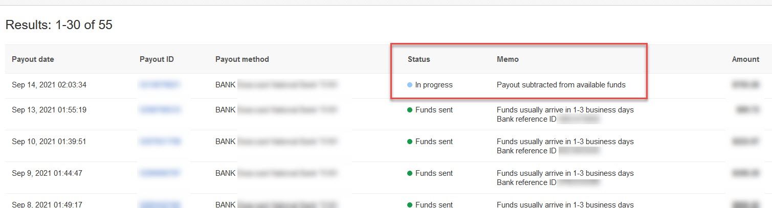 However, when checking the payout history tab, it does still list all previous payouts and shows that today's payout has been subtracted from available funds and is "in progress."