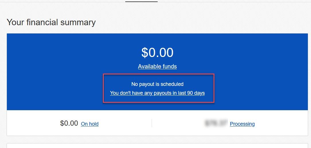 Sellers are reporting delayed processing of payouts yet again today. This one is particularly concerning because the way it displays on the Payments summary page says there have been no payouts in the last 90 days!