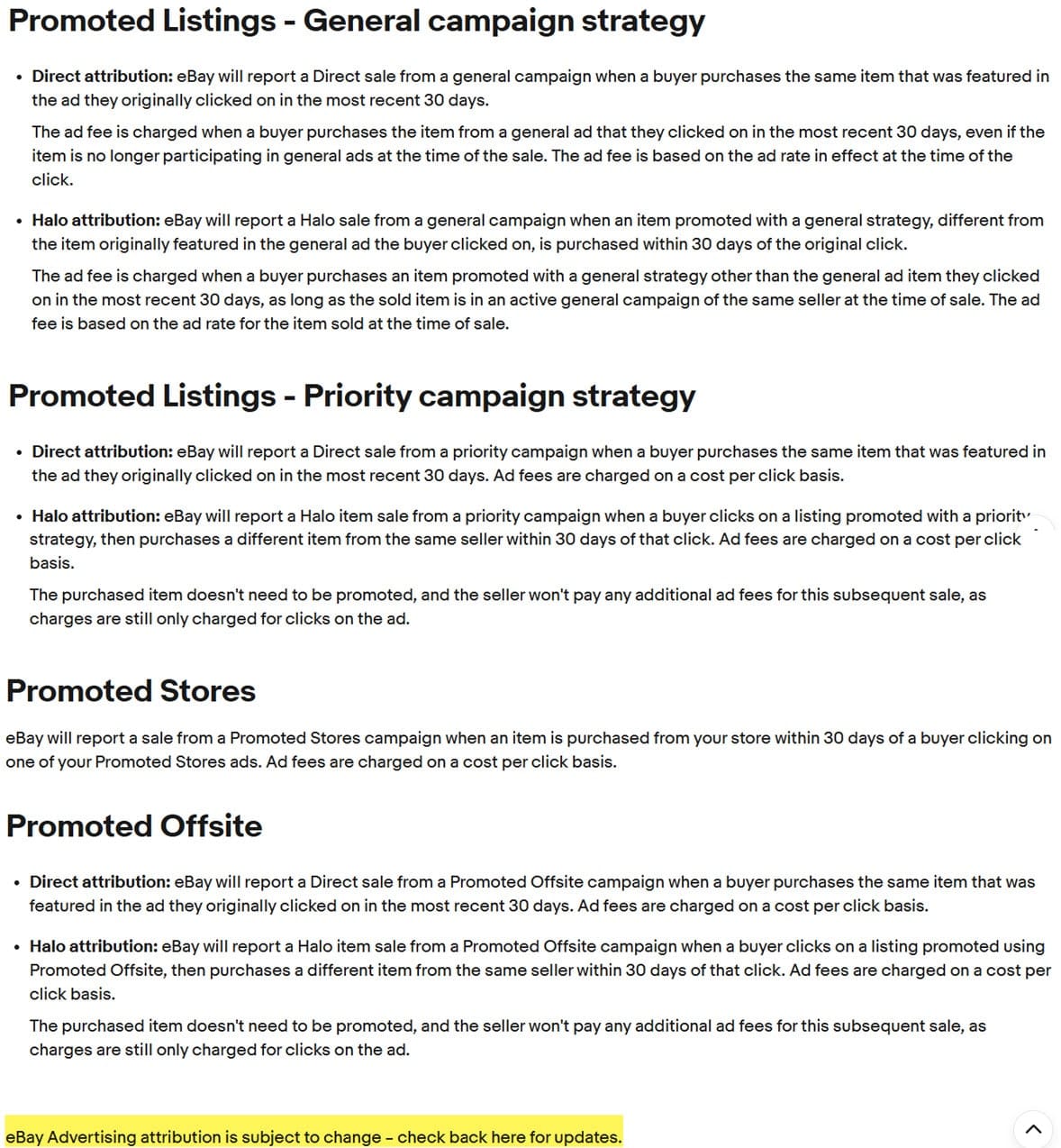 First, eBay has broken out explanations of how ad fee attribution works for Promoted Listings General cost per sale, Promoted Listings Priority cost per click, Promoted Store cost per click, and Offsite cost per click ads into a stand alone policy page for clarity and easy reference.