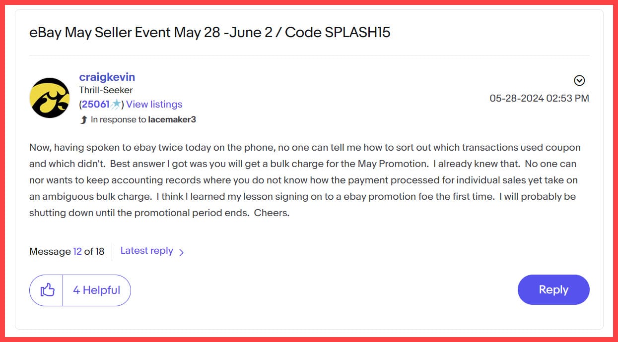 The sale event is live using code SPLASH15 with over 600 sellers participating, but several shared concerns that sales they've made so far today don't designate whether or not the coupon code was applied, so they have no way to track and prepare for how much eBay may invoice them for after the promotion has ended.