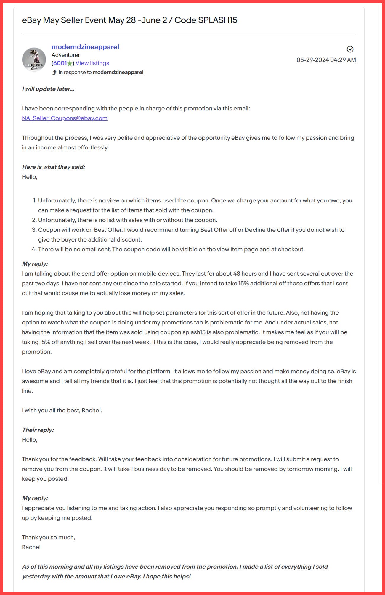 Some sellers have finally gotten through to eBay support to get their questions answered about how this Summer Sale deal will work with offers and how to track which orders had the coupon applied (spoiler alert: they can't).