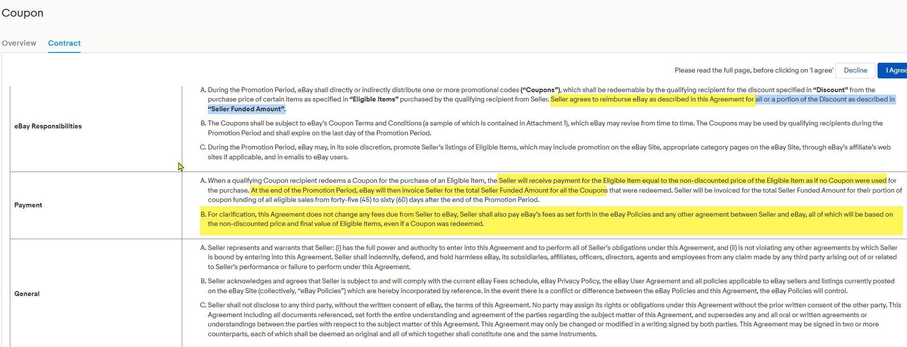 A seller posted a screenshot of the contract they would have to sign to participate in the coupon event in the eBay community with their concerns that the terms appear to say they will be paying full Final Value Fees on the non-discounted total for orders received using the coupon.