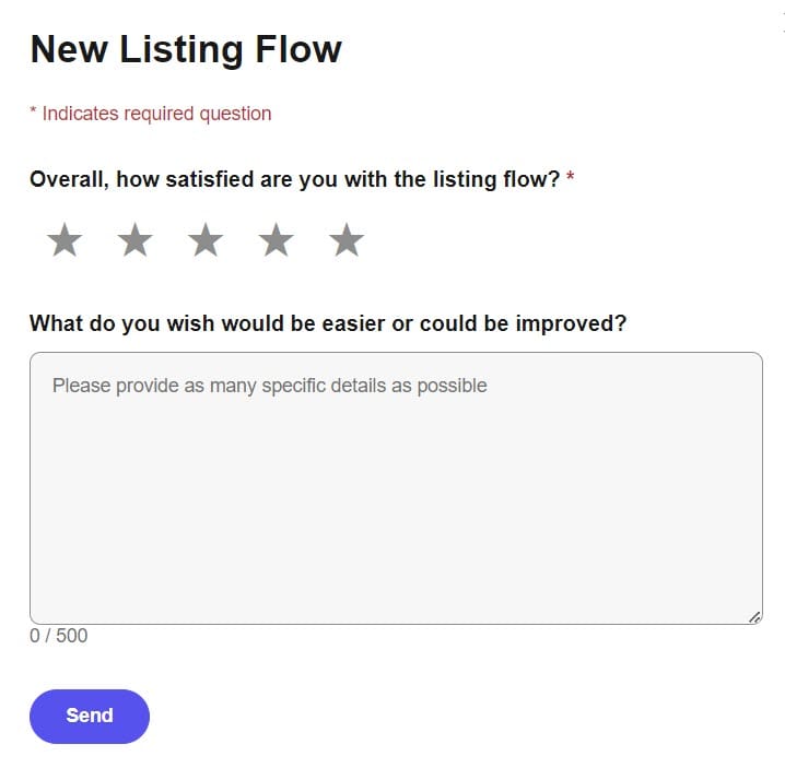 Or on the listing form, select the three dots in the upper right, then "Your Feedback" and leave a comment about the listing flow.