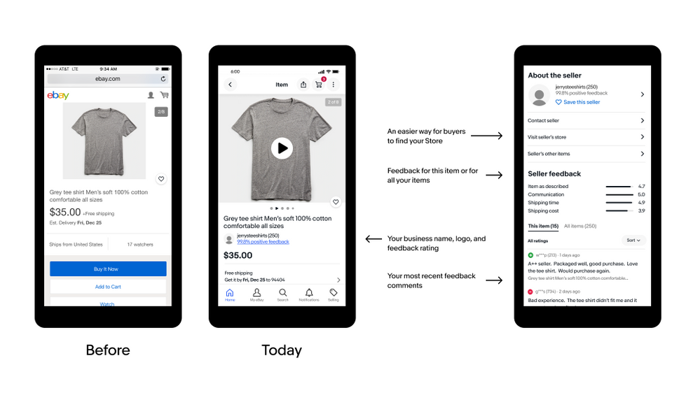 Second, we’re making important information about your business and feedback more visible to buyers. On mobile web, your seller name, logo, and feedback rating will now appear directly under your listing’s title, giving more visibility to your brand and business. You’ll also see your overall seller feedback and your most recent feedback comments displayed more prominently in the “About this seller” section.
