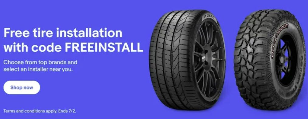 This Coupon is for free tire installation service of eligible items as listed below, valid from 5AM Pacific Time on June 16, 2023, through 11:59PM Pacific Time on July 2, 2023. Discount applies only to the installation price of eligible items purchased on eBay.com.Eligible items exclude warranties and protection plans, as well as items from the Coins & Paper Money, Gift Cards & Coupons, Vehicles in eBay Motors, and Real Estate categories. Coupon must be used within a single transaction, while supplies last.