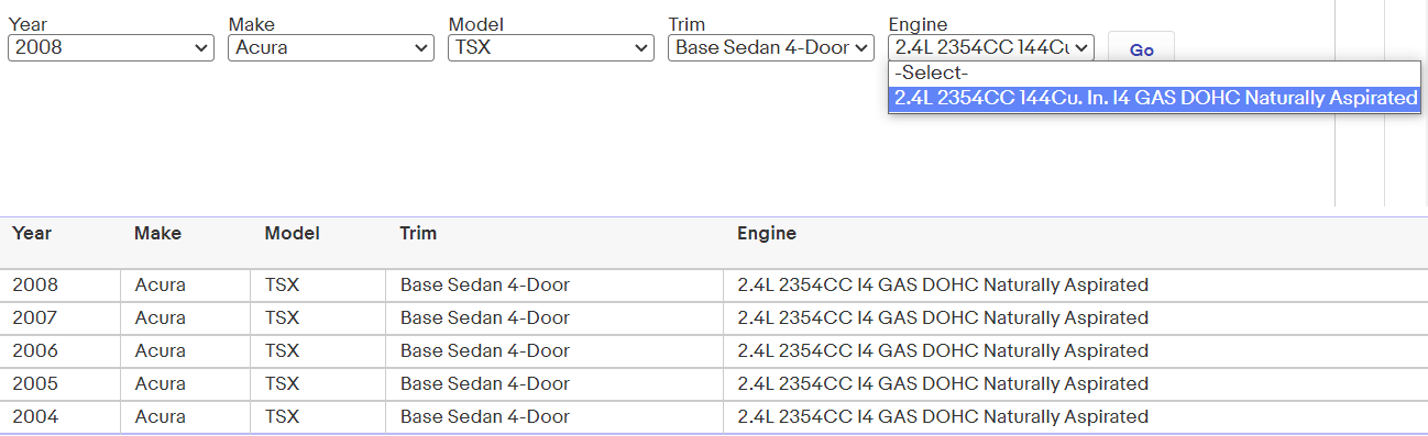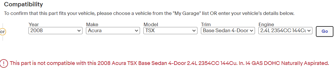 Here's what happens when you try to use eBay's fitment chart functionality on that listing - if you enter the year, make, model, trim, and engine options of the first vehicle listed in the chart, eBay's compatibility tool says it doesn't fit! 🤯