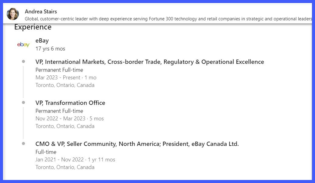 It's not entirely clear what this promotion means for Andrea Stairs, whose LinkedIn page still lists her current position as eBay CMO & VP, Seller Community, North America; President, eBay Canada Ltd.