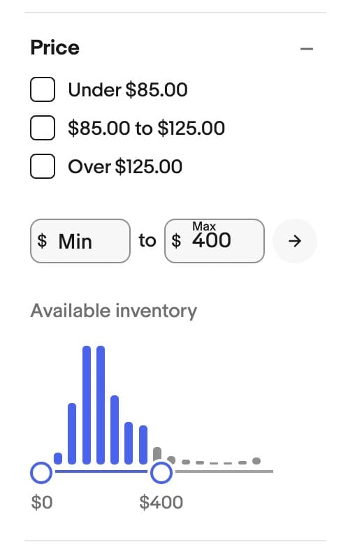The price filter now includes an interactive graph, allowing users to adjust their price range with ease. The updated graph offers a clear visual representation of price distribution within search results.