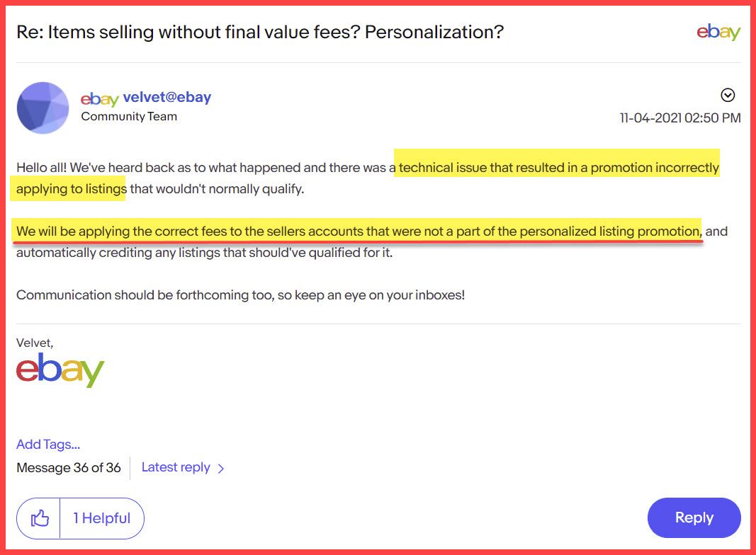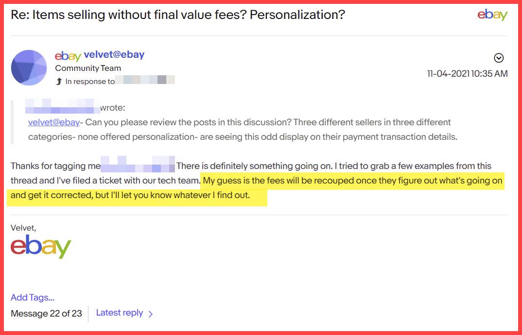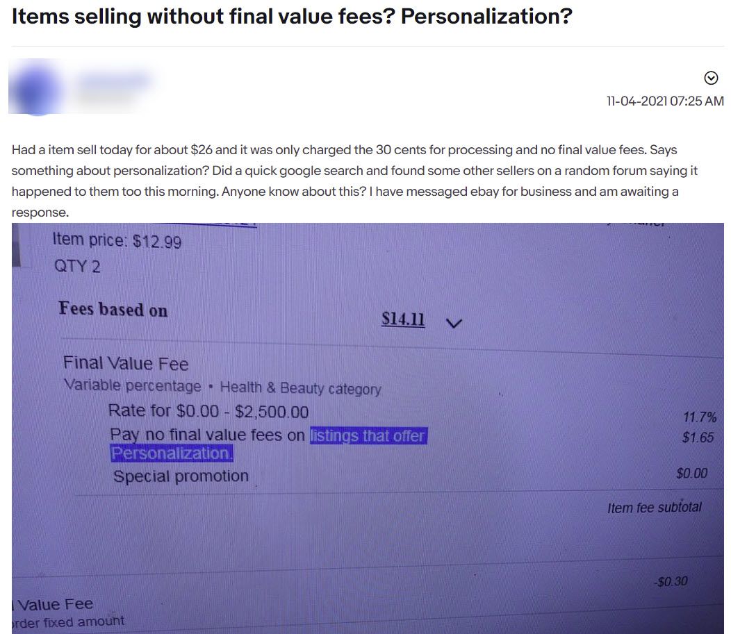 Sellers are reporting sales showing no Final Value Fees and a note that says "Pay no final value fees on listings that offer Personalization"